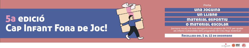 Creu Roja Joventut necessita per aquesta campanya de Nadal i Reis gairebé 48.000 joguines noves per poder atendre prop de 16.000 infants amb gran pobresa d’arreu de Catalunya. Dins de la campanya ‘Cap Infant Fora de Joc’, es recullen tot tipus de joguines per infants de totes les edats, però en especial els jocs cooperatius i llibres per a infants de 0 a 3 anys i de 10 a 12 anys. Entre els requisits, es demana que les joguines puguin ser noves -per garantir la higiene i seguretat-, no bèl·liques -per evitar comportaments agressius i no tolerants- i no sexistes -per no crear estereotips entre nens i nenes-.