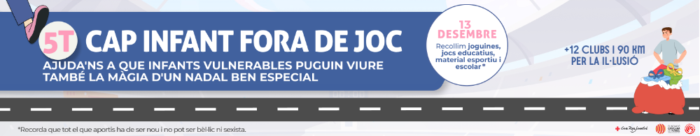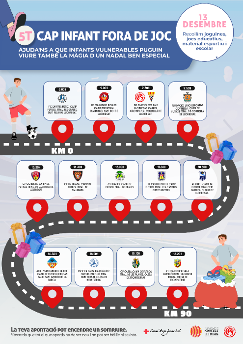 La campanya de Nadal vol unir futbol i solidaritat envers nens i nenes de casa nostra en risc d'exclusió social. Aquest any calen 48.000 joguines per poder atendre a gairebé 20.000 infants sense recursos. La Fundació Catalana de Futbol ja és a punt per a la 5a edició del repte solidari Cap Infant Fora de Joc. El repte clàssic tindrà lloc el proper dissabte, 13 de desembre, i comptarà amb la participació d'Héctor Robas, reponsable del CTA al Baix Llobregat i al Penedès-Garraf, ambaixador de la fundació de l'FCF, exàrbitre i ultrafondista, que correrà més de 90kms en menys de 12 hores per arribar als diferents clubs federats del Baix Llobregat participants del repte i enllaçant les diferents instal·lacions esportives per completar el recorregut.