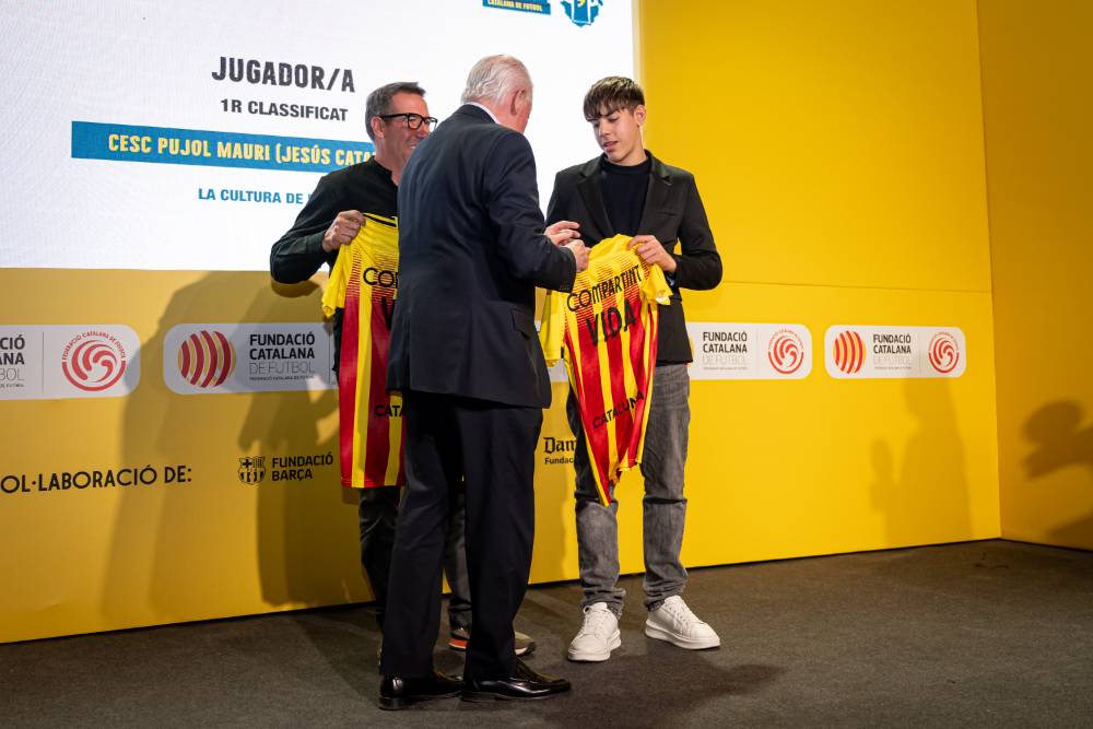 El jugador de 15 anys del CF Jesús Catalonia, Cesc Pujol, va recollir el guardó 'Premi Jugador/a' a la gala dels Premis Solidaris celebrada a l’Antiga Fàbrica Estrella Damm.